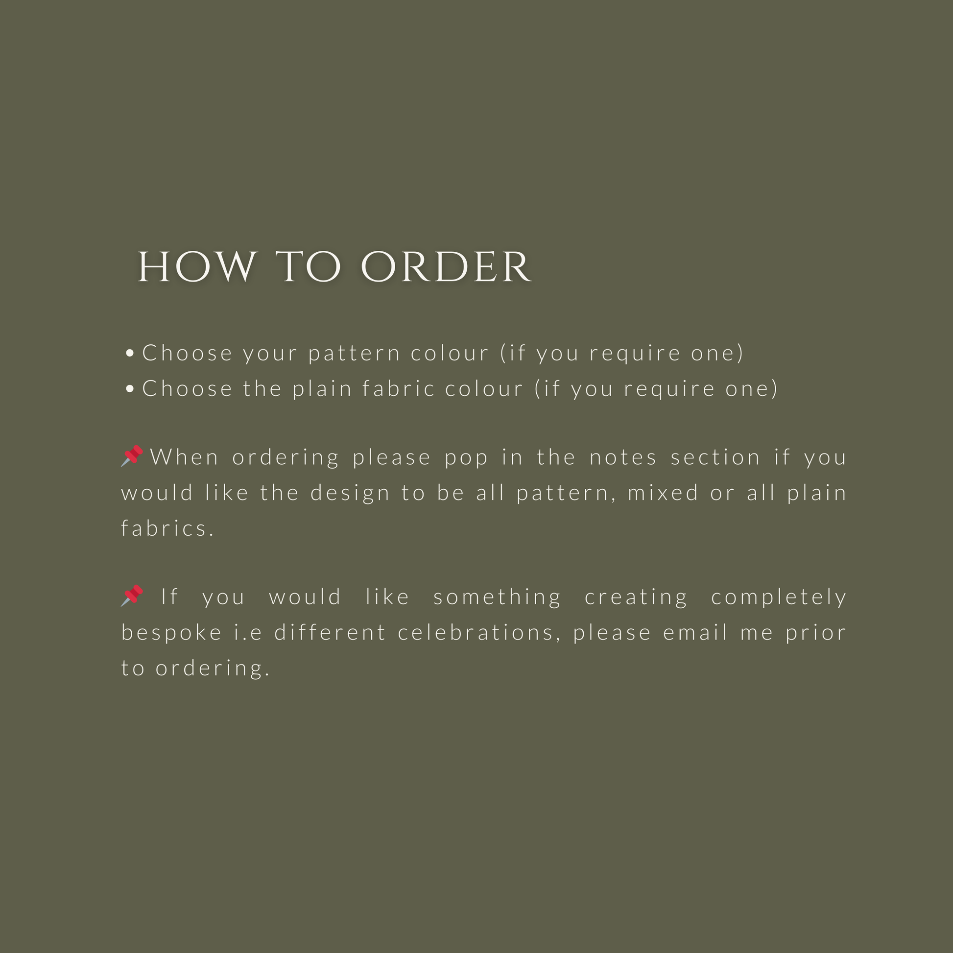 DESIGN: If you DO NOT want the garland mixed as shown, you can choose to have the letters all the same colour or pattern. Just pop me a message at the time of ordering to let me know.