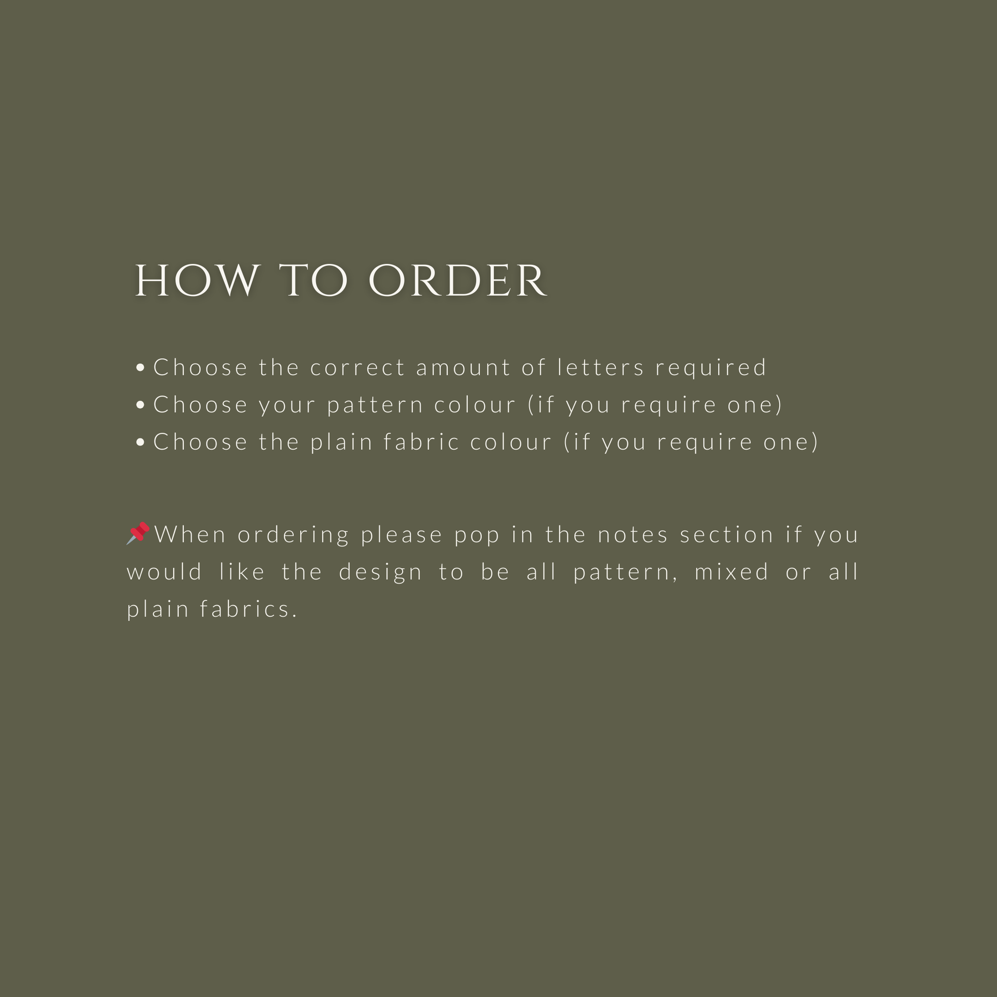 DESIGN: If you DO NOT want the garland mixed as shown, you can choose to have the letters all the same colour or pattern. Just pop me a message at the time of ordering to let me know.