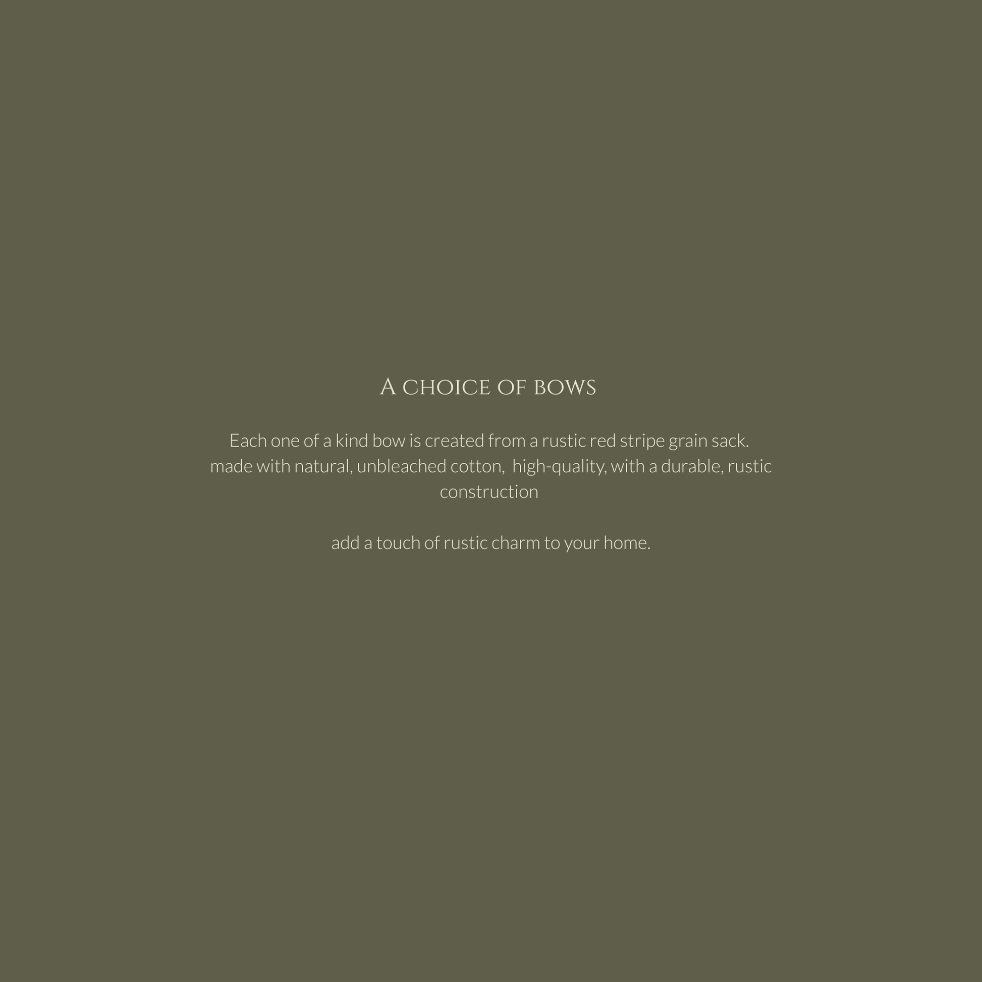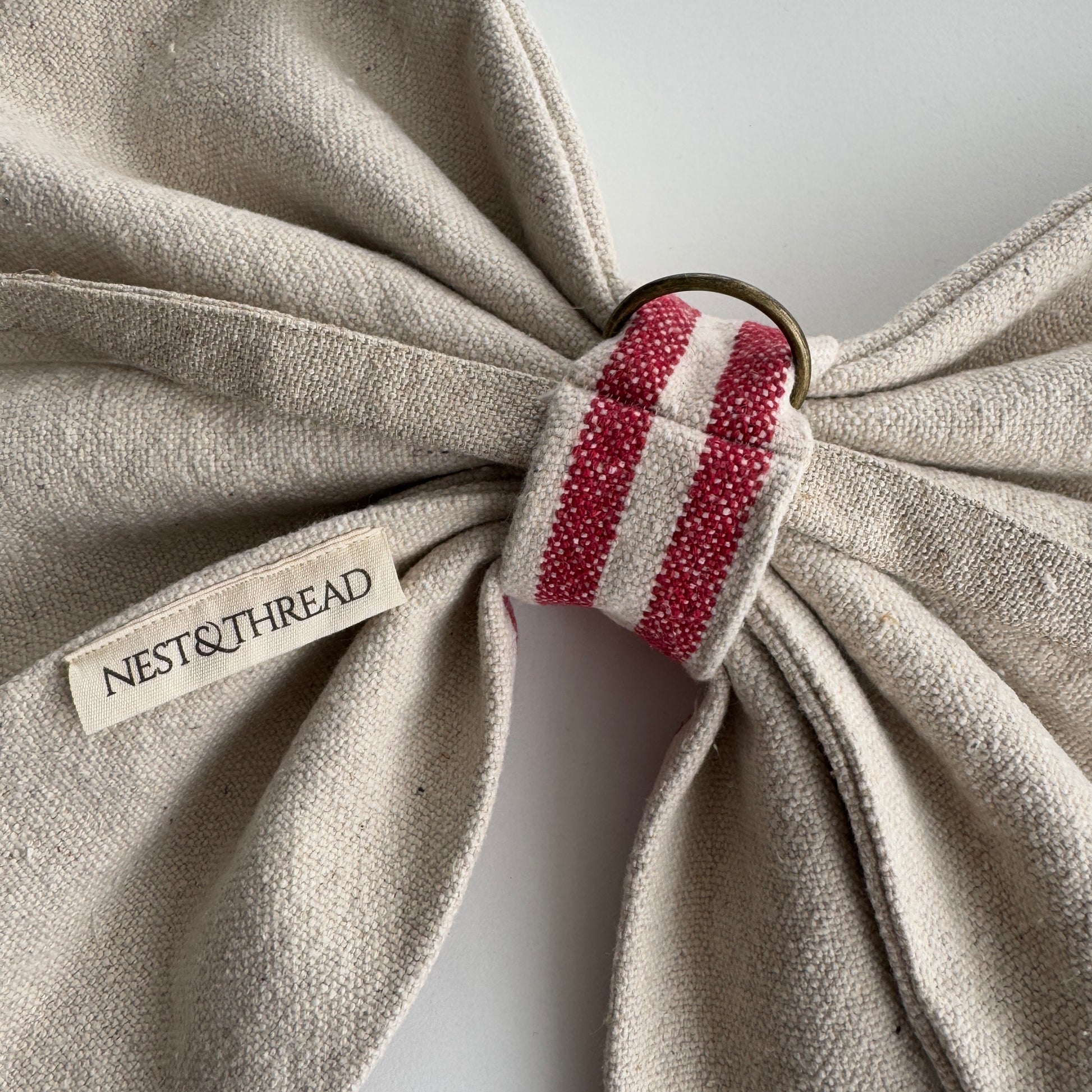 Bring a unique touch to your holiday decorations with this large grain sack bow, featuring distinct red stripes that capture the spirit of Christmas. No matter your style, it'll fit perfectly into your rustic cottage-style decor or a more modern approach.